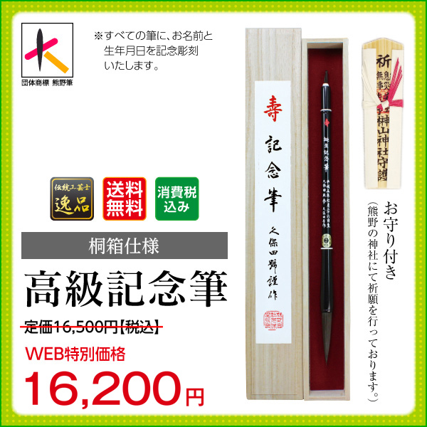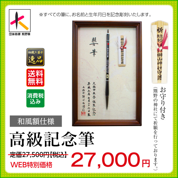 HOME 伝統工芸士が作る赤ちゃんの筆商品一覧です。 記念筆 記念筆は3種類あります。 【記念筆とは】 一度でも切ったことのある髪の毛で作る筆を「記念筆」と呼んでいます。 いつでも、どんな時でも、髪の毛で筆を作りたいと思ったときがチャンス。 赤ちゃんはもちろん、お子さまから大人まで、どなたの髪の毛でも作れます。 七五三・入学や卒業祝い・還暦祝い等の様々な節目に筆を作ってみませんか。 高級記念筆 桐箱仕様 箱に入れた記念筆です。 伝統的な高級桐箱入りです。 人の髪の毛はとても柔らかいので一般的な文字を書く筆には向きませんが、実際の書道筆と同様の伝統工芸の手法でお仕立てしております。 ※筆には記念日と名前が入ります。※お守りは付けないこともできます。 定価(税込):16,500円 WEB特別価格 16,200円(税込・送料込み)