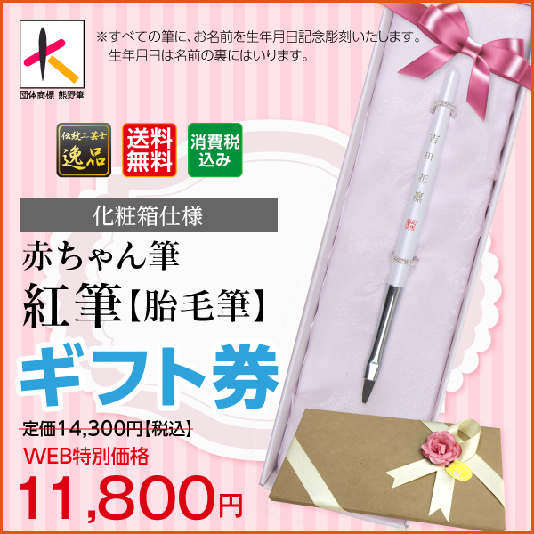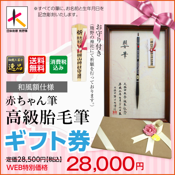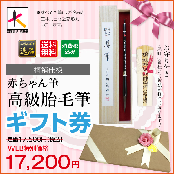 赤ちゃん筆熊野工房では、赤ちゃんの筆を出産祝いや誕生日のお祝いとして贈れるように引換えギフト券を用意しています。引換え券はギフトBOXにお入れして、お送りします。出産祝いのプレゼントとして最適です。